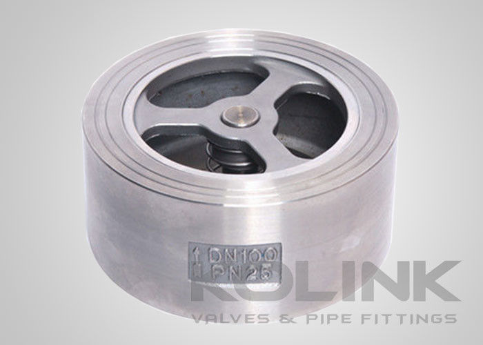 Βαλβίδα αντεπιστροφής τύπου Wafer από ανοξείδωτο χάλυβα, Μονής πλάκας, Κάθετης ροής Οι βαλβίδες αντεπιστροφής τύπου wafer μονής πλάκας αποτρέπουν την αντίστροφη ροή με την κίνηση του δίσκου που είναι παράλληλη με τη ροή. Με αυτό το σχεδιασμό, ο δίσκος είναι πάντα στην πορεία της ροής. Οι δίσκοι είναι ελατηριωτοί για να βοηθήσουν στην έδραση. Αυτές οι βαλβίδες αντεπιστροφής τύπου wafer είναι χωρίς καπάκι και εγκαθίστανται μεταξύ φλαντζών. Ο τύπος του δίσκου της βαλβίδας αντεπιστροφής έχει πολύ μικρή διαδρομή δίσκου και ανταποκρίνεται πολύ γρήγορα στη διακοπή ή την αναστροφή της ροής, ελαχιστοποιώντας έτσι την πιθανότητα υδραυλικού πλήγματος. Είναι κάπως καλύτερο από τη βαλβίδα αντεπιστροφής με κεκλιμένο δίσκο στην ελαχιστοποίηση του πιθανού υδραυλικού πλήγματος, αλλά με υψηλότερη πτώση πίεσης. Ανάλογα με το σχεδιασμό, όλες οι βαλβίδες αντεπιστροφής τύπου wafer πρέπει να αφαιρούνται από τη γραμμή για να εκτελεστεί συντήρηση λόγω του σχεδιασμού χωρίς καπάκι. Ο σχεδιασμός του δίσκου εν σειρά παράγει τη μεγαλύτερη πτώση πίεσης σε σύγκριση με άλλες βαλβίδες αντεπιστροφής του ίδιου μεγέθους.